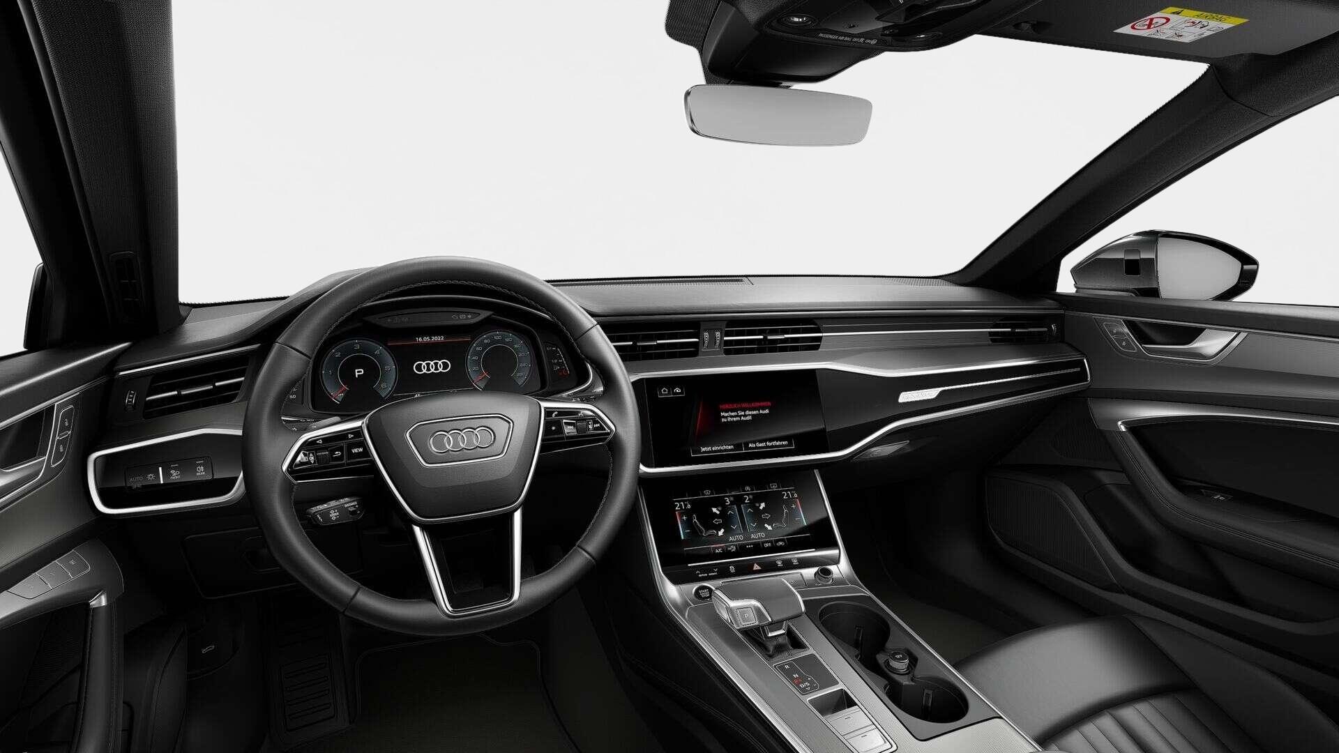 • Interieur: 4-Wege-Lendenwirbelstütze für die Vordersitze, Ambiente-Lichtpaket plus, Audi virtual cockpit plus, Bedientasten schwarz glänzend mit haptischem Feedback und Aluminiumoptik Interieur, Dachhimmel in Stoff schwarz, Dekoreinlagen Aluminium Dyade jangalsilber, Fußmatten vorn und hinten, Innenspiegel automatisch abblendend, rahmenlos, Interieurelemente unten in Kunstleder, Komfortmittelarmlehne vorn, Leder/Kunstleder mono.pur 550-Kombination, Lederlenkrad 3-Speichen mit Multifunktion und Schaltwippen, Rücksitzlehne, geteilt umklappbar, Sonnenblenden vorn