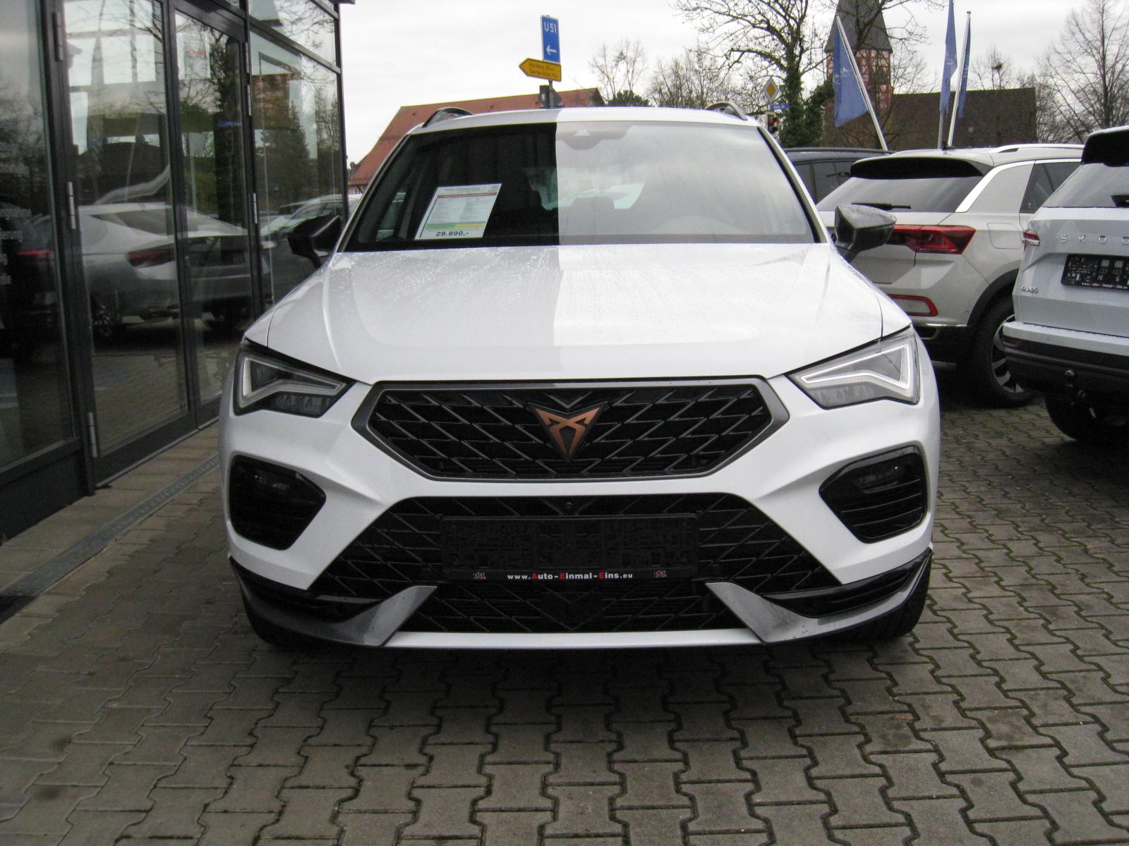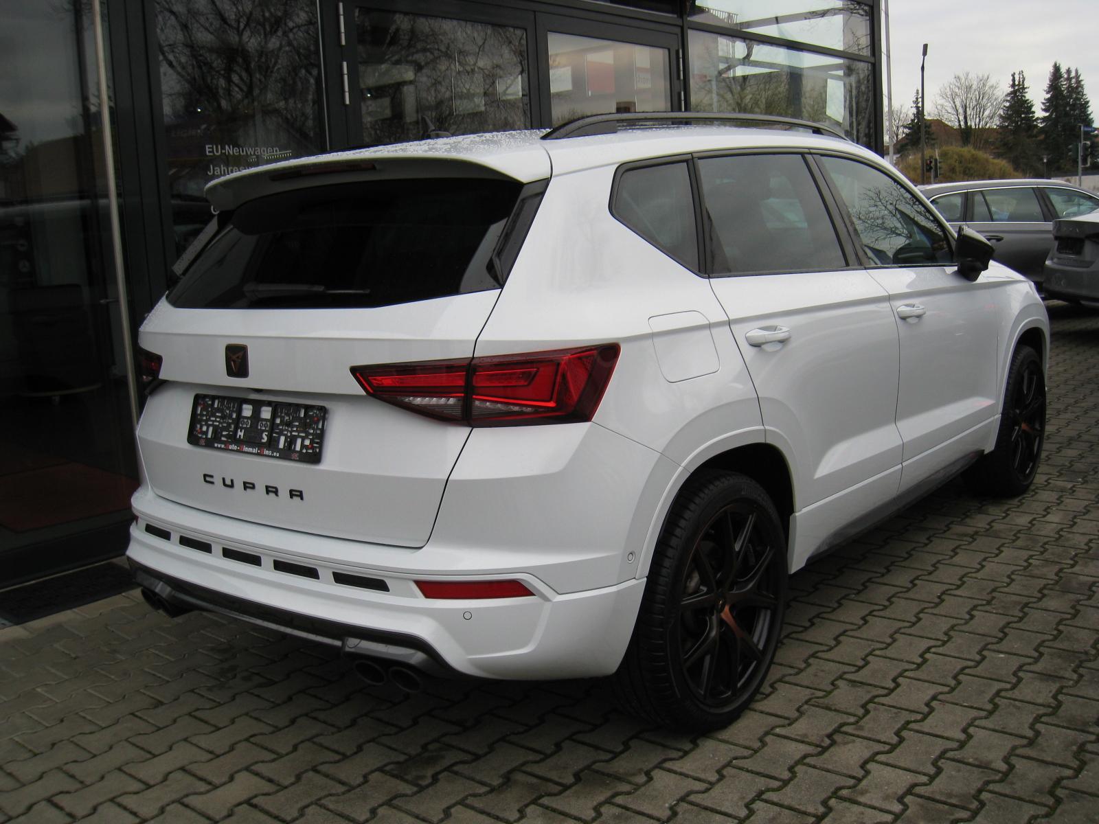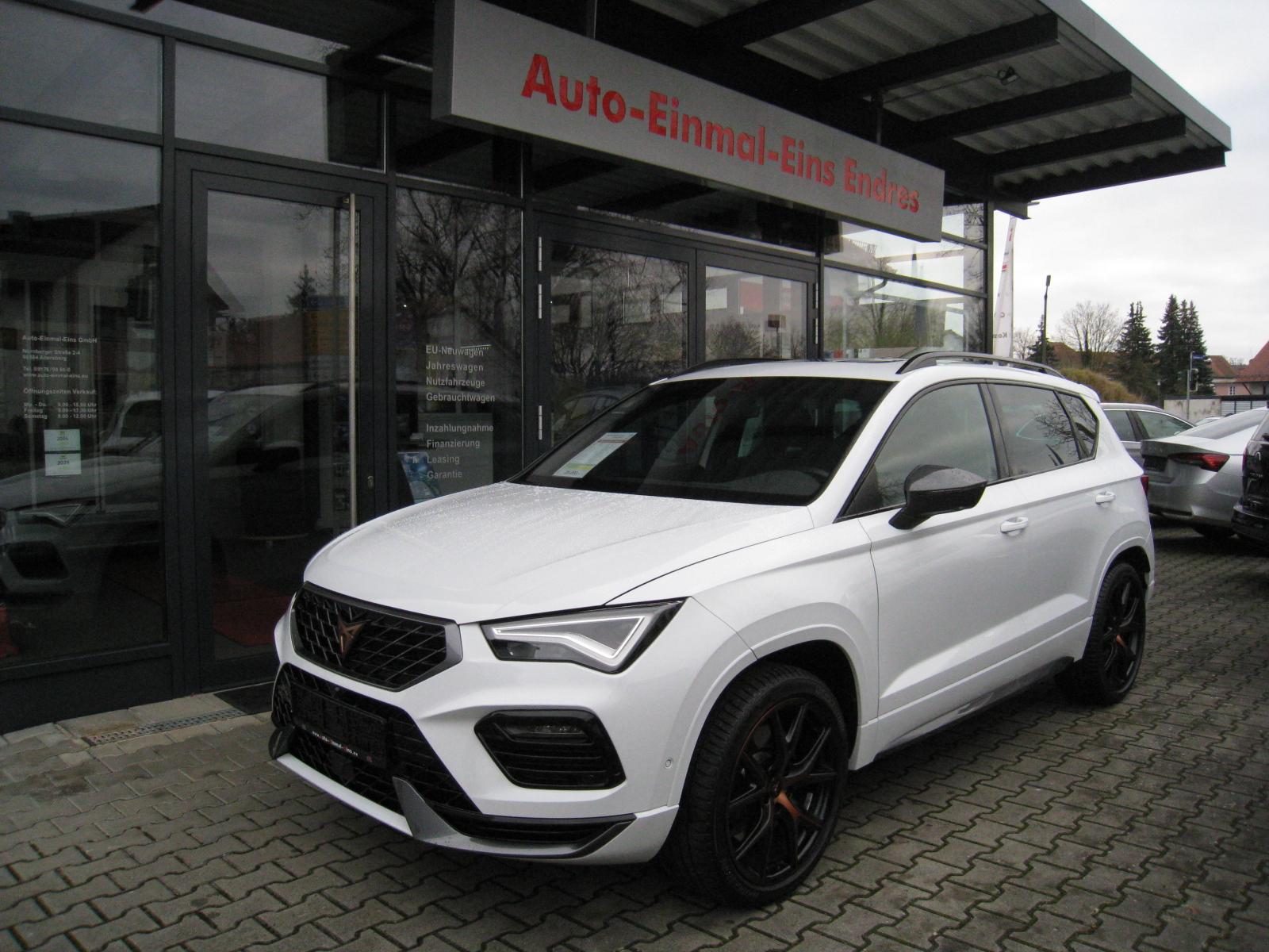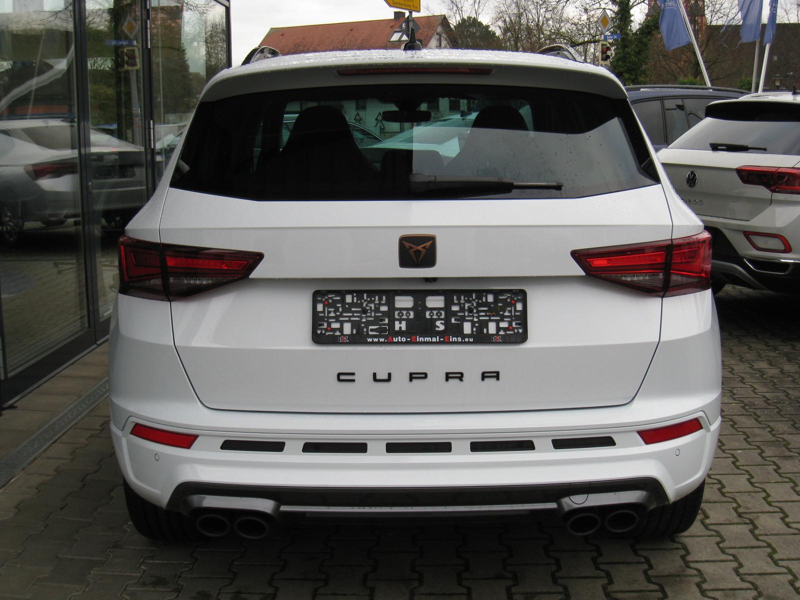 Ausstattung:WINTER-Paket (DK):- Sitzheizung vorne- Scheibenwaschdüsen beheizbar- AllradantriebLICHT/SICHT-Paket (DK):- Licht-/Regensensor: Fahrlicht-Assistent- LED-Hauptscheinwerfer- Nebelscheinwerfer- Tagesfahrlicht mit Assistenzfahrlicht und Coming-/Leaving-Home Funktion- Fernlichtassistent (High Beam Assist)KOMFORT-Paket (DK):- Kessy Advanced (schlüsselloses Schließ- und Startsystem)- ACC - Automatische Distanzregelung, Geschwindigkeitsregelanlage / Tempomat- Speed-Limiter- Klimaanlage Climatronic aut. 2-Zonen- Multifunktionssportlederlenkrad in CUPRA Design, beheizbar- Sportsitze vorne- Sitzbezüge in schwarzem Leder- Elektrischer Fahrersitz mit Memoryfunktion- Fahrersitz mit Lendenwirbelstütze- Elektrische Heckklappe (Virutelles Pedal)- Doppelter LadebodenINFOTAINMENT-Paket (DK):- DAB - Digitaler Radioempfang- Bluetooth Telefonvorbereitung für Handy- Navigationssystem mit 9,2 Zoll Farb-Touchscreen- BeatsAudio Soundsystem: Premium-Lautsprecher, Subwoofer 340 W-Verstärker, Surround-Technologie- Volldigitales Kombiinstrument mit 10,25 Zoll-TFT-Display- CUPRA Connect- CUPRA Full Link (Android Auto und Apple CarPlay)- Top View 360 Grad Kamera- 4 USB-C Schnittstellen (2 vorne und 2 hinten)- Induktives Laden für Smartphone- SprachsteuerungASSISTENZ-Paket (DK):- Parklenkassistent- Spurhalteassistent (Lane-Assist) plus Emergency Assist und Stauassistent (Travel Assist) - Spurwechselassistent (Side Assist)- Safe and Driving XL: Fahrassistent (Travel Assist) Ausstiegsassistent (Exist Assist) Proaktives Insassenschutzsystem (PreCrash) Seitenassistent- Front Assist mit City-Notbremsfunktion- Verkehrszeichenerkennung- Müdigkeitserkennung- Pan-European-eCall- Elektrisch Differentialsperre (XDS)Ateca-OPTIK-Paket (DK):- 19 Zoll Alu-Felgen "Exclusive" Kupfer - Reifen 245/40 R19 94W- Sunset: extra getönte Scheiben ab B-Säule- Dachreling in Schwarz- Panorama-Glasschiebedach elektrisch- Dachhimmel in schwarzABS/ASR und ESPNotrad 18 ZollAmbientebeleuchtungDoppel-/Seiten-/KopfairbagsKnieairbag auf der FahrerseiteBeifahrerairbag-DeaktivierungAußenspiegel elektrisch einstellbar, elektrisch anklappbar und beheizbarInnenspiegel automatisch abblendbarFensterheber elektrisch vorne und hintenRücksitzbank umklappbarBeifahrersitz höhenverstellbarReifendruckkontrolleMittelarmlehne vorne und hintenStart & Stop SystemISOFIXVorbereitung für AnhängevorrichtungInfo: Stoßfänger/Kotflügel vorne ersetzt und Türe hinten links lackiert