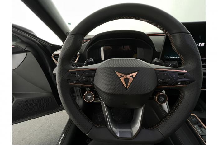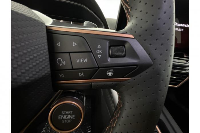 Auf Wunsch Lieferung vor Ihre Haustüre, Eu-weite Werksgarantie, nachrüstbare Extras auf Anfrage, deutsche Bedienungsanleitung 6 Lautsprecher, App Connect, Bluetooth, Connectivity Box inkl. Wireless Charger, Digitaler Radioempfang DAB , Freisprecheinrichtung, Navigationssystem, Sprachsteuerung, Touchscreen-Display, USB-C-Schnittstelle 2 vorne / 2 hinten (Ladefunktion), Wireless Full Link Connectivity inkl. Android Auto und Apple CarPlay, Automatisch abblendendes Fernlicht, Automatische Coming- und Leaving-Home-Funktion, Blendfreies Fernlicht, Infinity Light, Dynamisches LED-Lichtband am Heck und beleuchtetem CUPRA Logo, LED - Tagfahrlicht, Lichtsensor, Matrix-LED-Scheinwerfer mit Signatur Ceremony, Nebelscheinwerfer, Smart Ambient Light, Tagfahrlicht, Türeinstiegsleisten beleuchtet, vorne, Voll-LED-Heckleuchten, Fensterheber elektrisch vorne und hinten, Fensterheber elektrisch, mit Einkleschutz und One-Touch-Funktion, Seitenscheiben ab 2. Sitzreihe und Heckscheibe dunkel getönt, CUPRA Supersport-Multifunktionslenkrad mit CUPRA Mode Selector, beheizbar, Dachhimmel in Schwarz, Durchladeeinrichtung, Innenspiegel automatisch abblendend, Lederlenkrad, Lenkrad höhen- und tiefenverstellbar, Lenkradheizung, Mittelarmlehne vorn, Mittelarmlehne vorne und hinten, Nichtraucherausführung, Schaltwippen am Lenkrad, Sportlenkrad, Variabler Gepäckraumboden mit Staufächern im Gepäckraum, 3 Klimazonen, Climatronic mit 3-Zonen-Temperaturregelung, Dynamic Design Paket, Edge Paket, Intelligent Drive Paket XL (Spurwechselassistent ''Side Assist'' inkl. Totwinkel- und Ausparkassistent mit Ausstiegswarnung Spurhalteassistent Plus inkl. Travel Assist, Emergency Assist und Stauassistent PreCrash Assist (Proaktives Insassenschutzsystem) Top View Kamera Parklenkassistent ''Intelligenter Park Assist''), Licht-und-Sicht Paket, Pure Performance Paket inkl. Matrix LED-Scheinwerfer, Winter-Paket (Vordersitze beheizbar), 19 Leichtmetallräder Sandstorm Black/ Copper, glanzgedreht, Sommerreifen, ABS (Antiblockiersystem), Airbag für Fahrer und Beifahrer, Beifahrerairbag-Deaktivierung, Diebstahl-Warnanlage inkl. Innenraumüberwachung, Back-up-Horn und Abschleppschutz, ESP (Elektronisches Stabilitätsprogramm), ISOFIX-Kindersitz-Sicherungssystem, in der 2. Sitzreihe links und rechts inkl. Top-Tether-Verankerungspunkte, Kopfairbag-System, vorne und hinten, Notruf-Service, PreCrash Assist (Proaktives Insassenschutzsystem), Seitenairbag für Fahrer und Beifahrer, Seitenairbags hinten, Servolenkung, Beifahrersitz höhenverstellbar, CUPRA Sportschalensitze vorne mit Sitzmittelbahn in Dinamica, in Soul Schwarz mit Akzenten in Astro Blau, Fahrersitz elektrisch einstellbar mit Memory Funktion, Fahrersitz höhenverstellbar, Geteilte Rücksitzbank, Lendenwirbelstütze Fahrerseite, elektrisch einstellbar, Rücksitzlehne asymmetrisch geteilt umklappbar, Sitzheizung, Anschlussgarantie 3 Jahre / 100.000 km, CUPRA Connect Plus (3 Jahre), 230-V Steckdose, Automatische Distanzregelung ACC, Automatische Heckklappe, CUPRA Drive Profile, Einparkhilfe vorne und hinten, Elektronische Parkbremse inkl. Auto Hold Funktion, Exit Assist, Fernlichtassistent, Intelligenter Parklenkassistent, Kessy Advanced, Schlüsselloses Schließ- und Öffnungssystem, Müdigkeitserkennung, Regensensor, Reifenkontrollanzeige, Rückfahrkamera, Side Assist inkl. Totwinkelassistent, Spurhalteassistent Plus inkl. Travel Assist, Emergency Assist und Stauassistent, Spurwechselassistent, Top View Kamera, Ultraschall-Einparkhilfe, vorne und hinten, Umfeldbeobachtungssystem Front Assist mit City-Notbremsfunktion, Verkehrszeichenerkennung, Virtual Cockpit, Zentralverriegelung, Zentralverriegelung mit Funkfernbedienung, Adaptive Fahrwerksregelung DCC, Anhängevorrichtung, schwenkbar mit elektrischer Entriegelung und Anhängerrangierassistent, Außenspiegel elektrisch einstell-, anklapp- und beheizbar, Außenspiegel elektrisch einstellbar, Außenspiegelkappen in Dark Aluminium, Dachreling in Glossy Black, Heckklappe elektrisch betätigt (Öffnung & Schließung) inkl. Sensorgesteuerter Öffnung & Schließung (Virtual Pedal), Leisten an den Seitenfenstern (außen) in Glossy Black, EU-Fahrzeug mit Tageszulassung