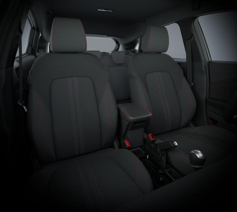 • Schwarzer Stoffbezug mit roter Naht