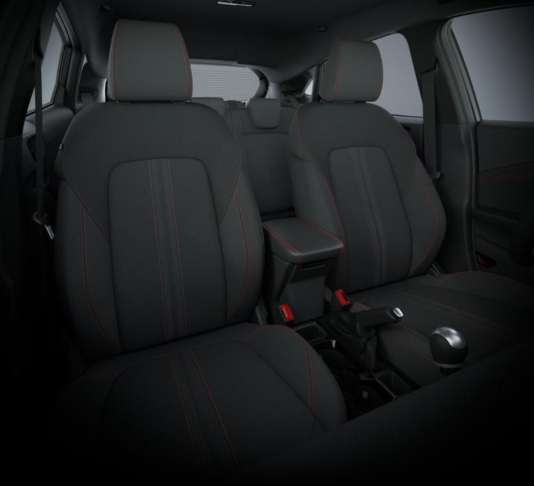 • Schwarzer Stoffbezug mit roter Naht
