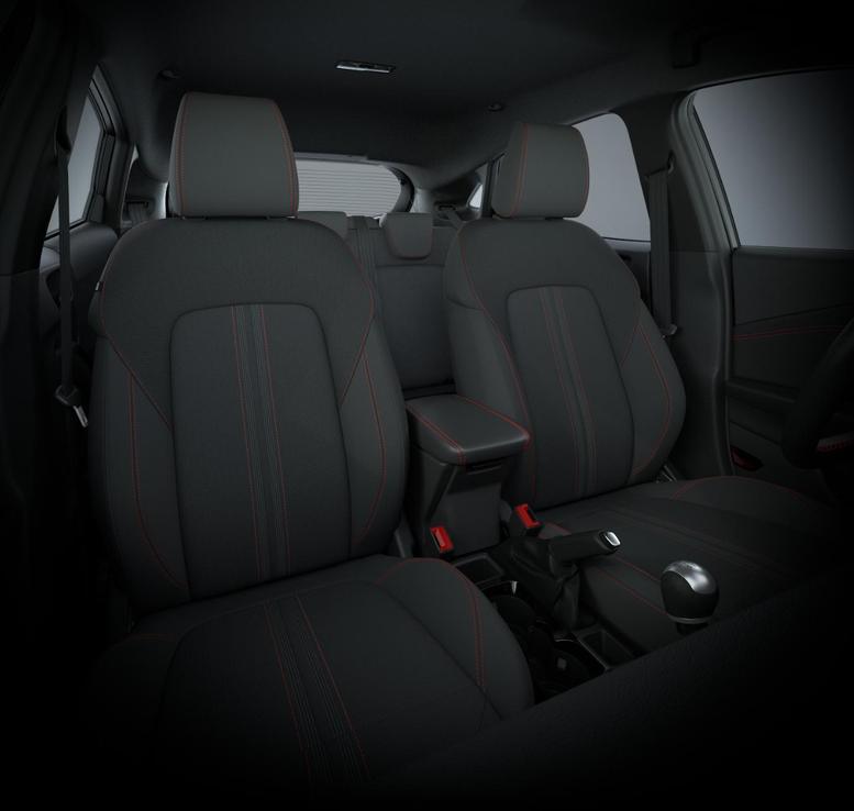 • Schwarzer Stoffbezug mit roter Naht