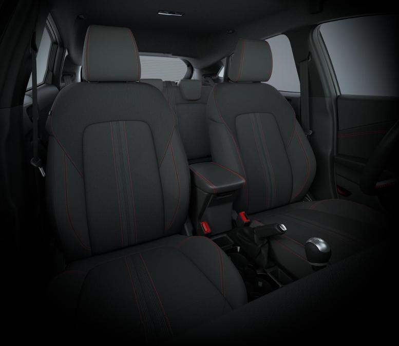 • Schwarzer Stoffbezug mit roter Naht