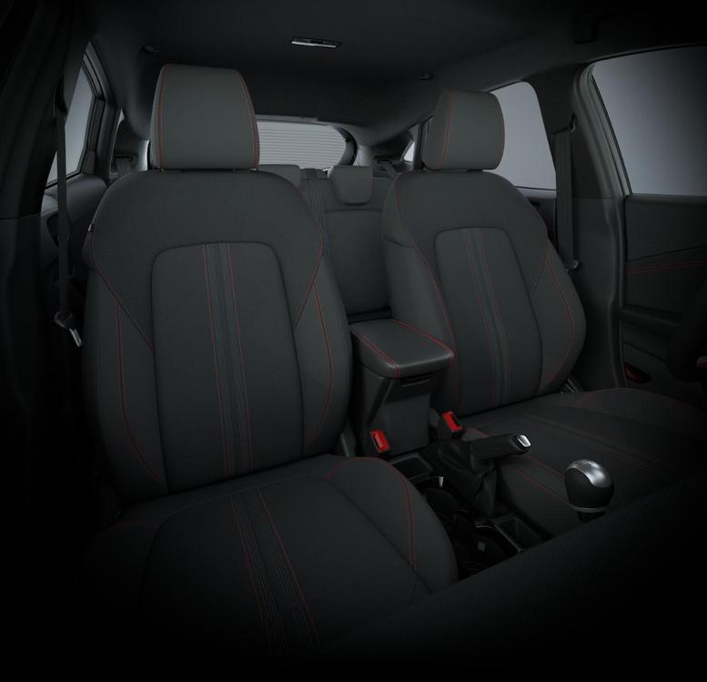 • Schwarzer Stoffbezug mit roter Naht
