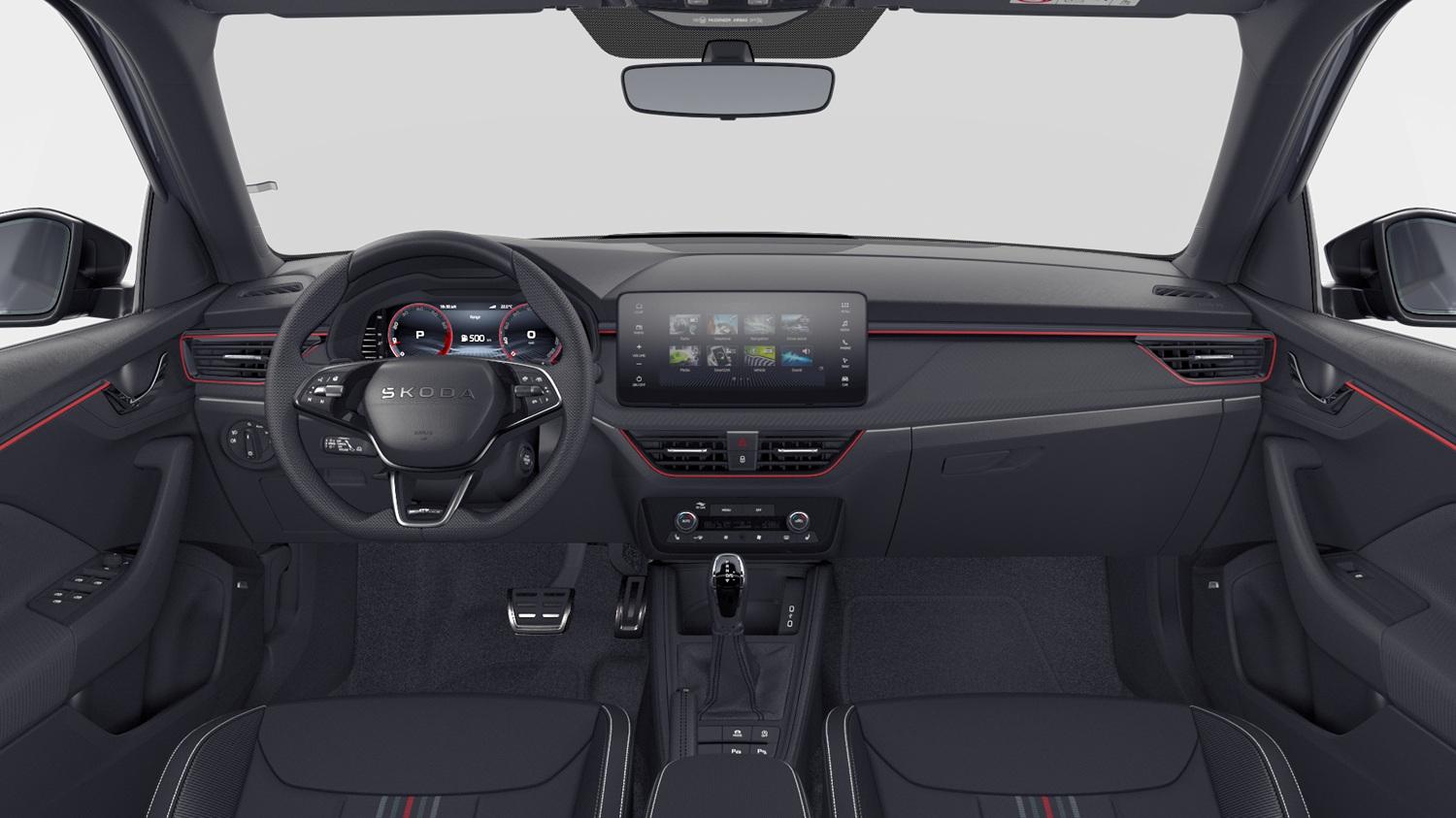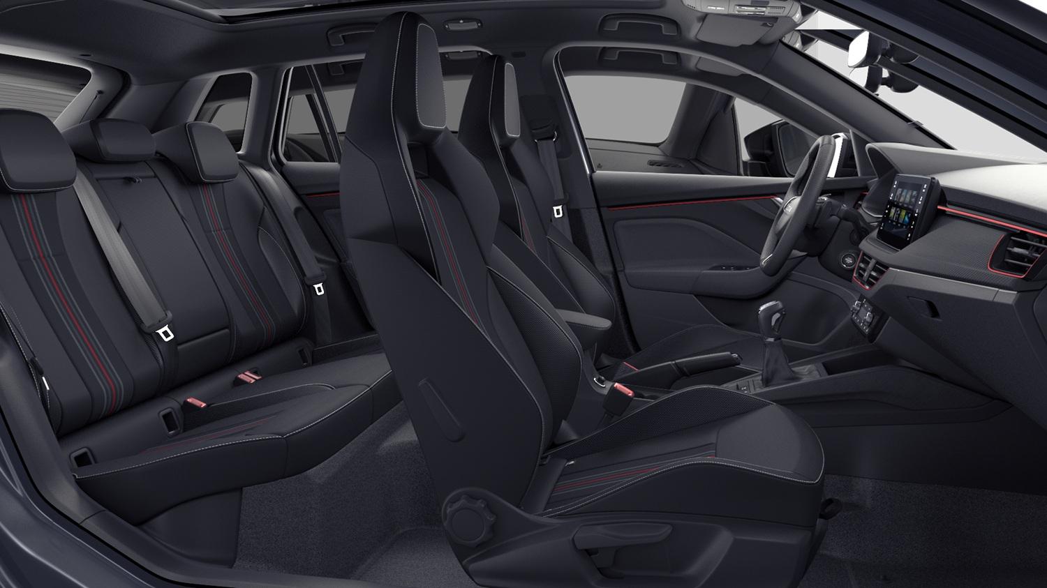 Innenausstattung Design Selection MONTE CARLO, Sportsitze vorn mit integrierten Kopfstützen, Stoffsitzbezüge Monte Carlo Schwarz/Rot/Grau, Dekor Monte Carlo Carbon, Interieurleisten und Luftausströmerumrandung Schwarz glänzend mit Kontrastline Rot, LED-Ambientebeleuchtung (2-farbig, Weiß oder Rot), Mittelarmlehne hinten, Türeinstiegsleisten vorn und hinten, Pedalerie in Edelstahl-Optik