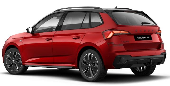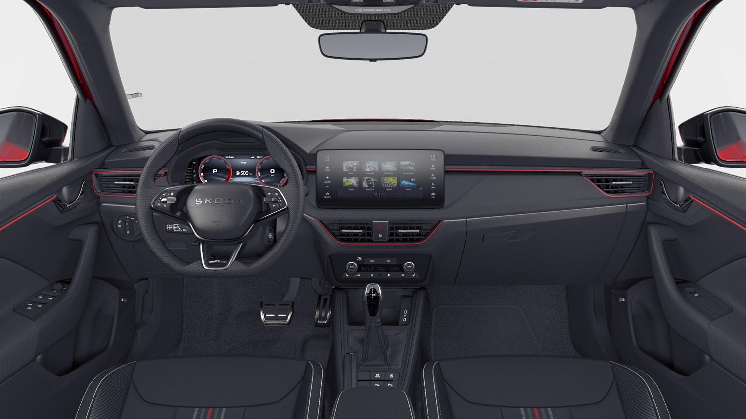 Innenausstattung Design Selection MONTE CARLO, Sportsitze vorn mit integrierten Kopfstützen, Stoffsitzbezüge Monte Carlo Schwarz/Rot/Grau, Dekor Monte Carlo Carbon, Interieurleisten und Luftausströmerumrandung Schwarz glänzend mit Kontrastline Rot, LED-Ambientebeleuchtung (2-farbig, Weiß oder Rot), Mittelarmlehne hinten, Türeinstiegsleisten vorn und hinten, Pedalerie in Edelstahl-Optik
